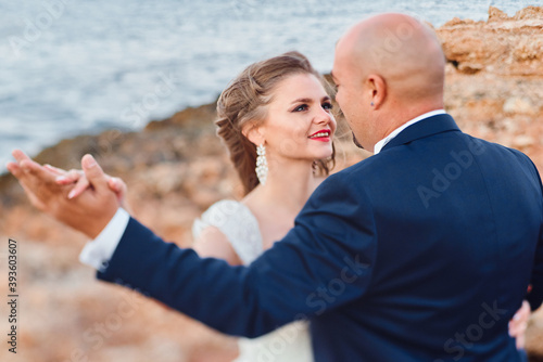 Obraz premium newlywed couple hugging on the seashore and rocks