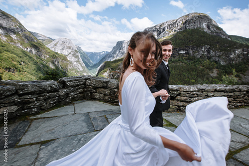 © Alexey Tsibin, Naklejka premium newlyweds running together on a stone path against the background of mountains
