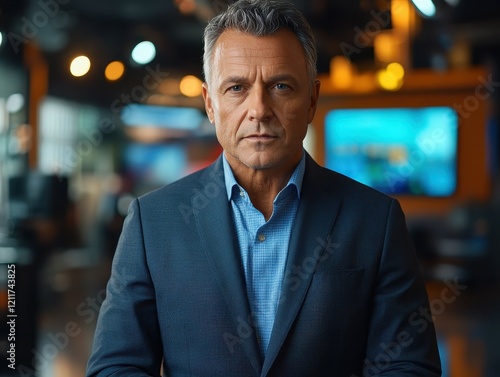 © artemstepanov, Fototapeta premium News anchor, presenting breaking news, serious expression, TV studio background, confident