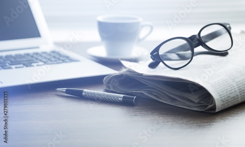 Fototapeta premium Newspapers with glasses and laptop. Online news.
