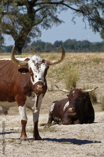 Fototapeta premium Nguni cattle of north east Namibia with large horns in arid terrain under strong African sunlight near Ndhovu, Caprivi Strip, Namibia, Africa