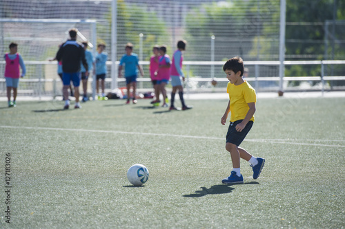 © Angel Simon, Fototapeta premium Niño en un entrenamiento de fútbol 7, deportes de equipo para actividades extraescolares