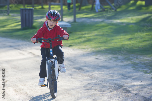 © Angel Simon, Naklejka premium Niño pequeño practicando deporte ciclismo montando en bicicleta en un parque en su rato de ocio