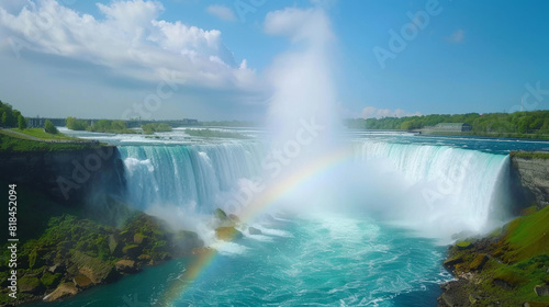 Fototapeta premium Niagara Falls with rainbow mist rising from the cascading water, providing...