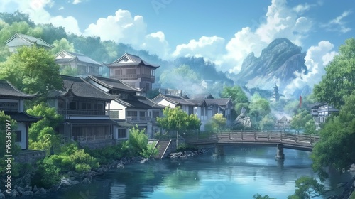 © ThienThu, Fototapeta premium nice anime background of asian landscape with nice bridge view