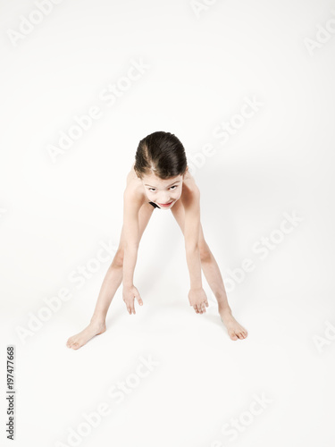 © kravik93, Naklejka premium Nice barefoot boy in sport outfit stretching back muscles, looking relaxed