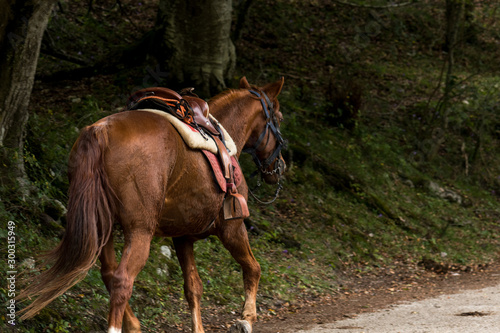 © jon, Obraz premium Nice brown horse with its chair strolling through the forest