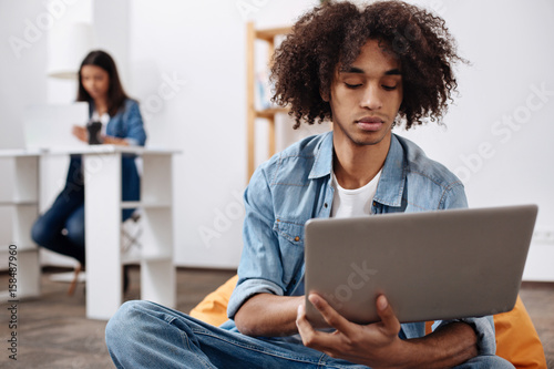 Fototapeta premium Nice committed man typing a letter on his laptop