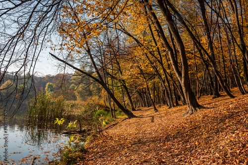 Fototapeta premium Nice day light autumn forest landscape in Kiev Ukraine nature