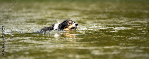 © Karoline Thalhofer, Fototapeta premium nice dog in the low water in the lake - border collie