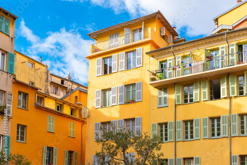 Fototapeta premium Nice, France, colorful facade, with typical windows, balconies and shutters