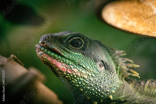 © Serhii, Obraz premium Nice green lizard iguana head portrait close up macro reptile nature