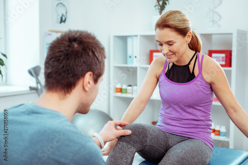 © zinkevych, Fototapeta premium Nice pleasant woman looking at her knee