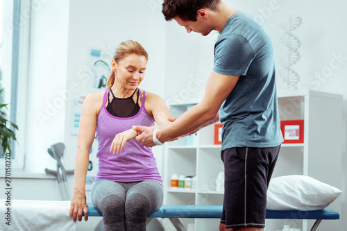 Fototapeta premium Nice positive woman looking at her arm