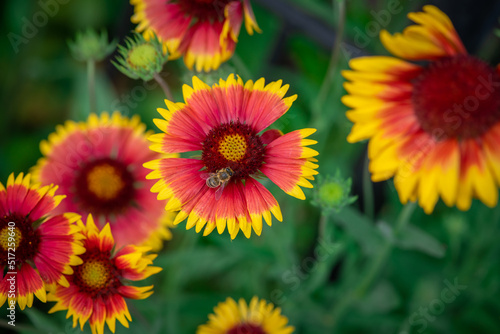 © Serhii, Fototapeta premium Nice summer yellow and red flowers with bee at sunny evening, macro nature and flora