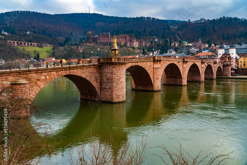 © H-AB Photography, Naklejka premium Nice view of Heidelberg's arch bridge Karl-Theodor-Brücke or Alte Brücke (Old Bridge) with its gate and two towers over the Neckar river. In the background is the castle ruin Heidelberger Schloss.