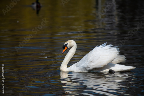 © Serhii, Fototapeta premium Nice white swan sweeming on lake at summer sunny day, nature and wild life birds