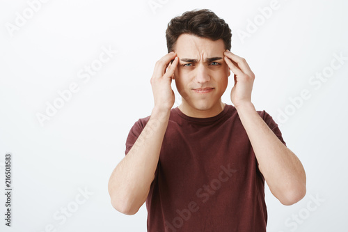 © Cookie Studio, Naklejka premium Nie można skupić się na pracy z powodu bólu głowy. Portret ponurego, nieostrego atrakcyjnego mężczyzny, marszczącego brwi i grymasów od bólu głowy, cierpiącego na migrenę i szukającego środków przeciwbólowych