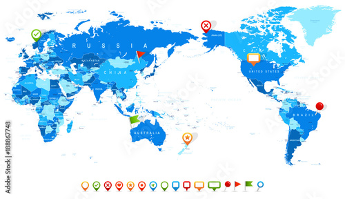 © Porcupen, Obraz premium Niebieska mapa świata i ikony - Azja w środku