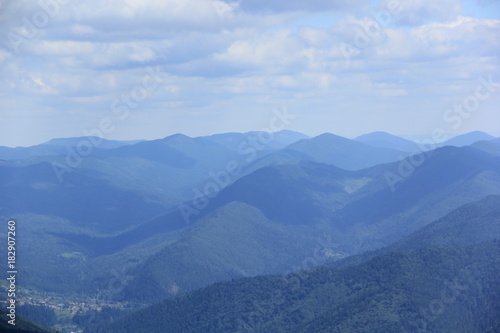 © Free_styler, Fototapeta premium Niebieski niewyraźne mgliste tło Karpat i ośrodka narciarskiego Bukovel w lecie