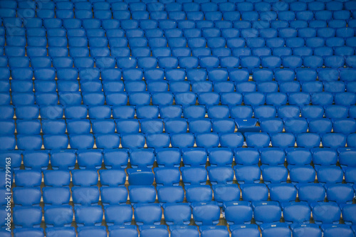 © vitleo, Naklejka premium Niebieskie puste miejsca na stadionie piłkarskim. Żółte schody z kilkoma sektorami.