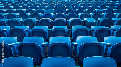 © Mahemud, Naklejka premium Niebieskie trybuny: Siedzenia trybun na stadionie sportowym. Pusta arena zewnętrzna. Koncepcja kibiców. Krzesła dla publiczności. Koncepcja środowiska kulturowego. Kolor i symetria.