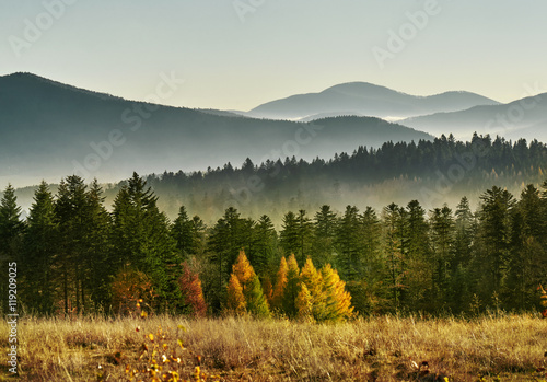 © alekosa, Fototapeta premium Niesamowity krajobraz górski z mgłą. Beskidy. Polska. M
