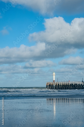 Fototapeta premium Nieuwpoort, West-Vlaanderen, Belgium, Ocotber 25th, 2025, serene coastal scene, quiet seaside pathway leading to lighthouse amidst clouds and reflections