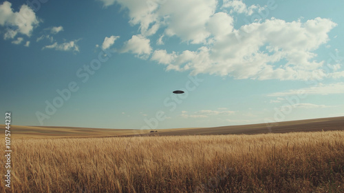 © Sawyer0, Obraz premium Niezidentyfikowane zjawisko na niebie zaobserwowane nad polem, gdzie na tle przestrzeni rozpościera się tajemniczy obiekt, przyciągający uwagę swoim niezwykłym kształtem.