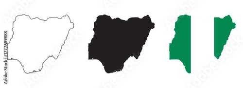 Naklejka premium Nigeria map vector set with editable country outline black silhouette and national flag design featuring green white green vertical stripes isolated on white background for geography