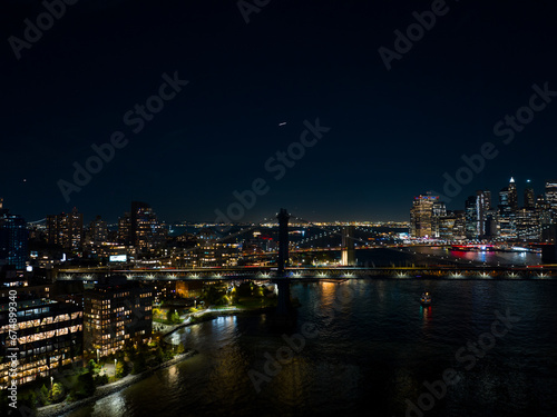 © Felix Mizioznikov, Obraz premium Night aerial photo Dumbo New York. View of river and bridges