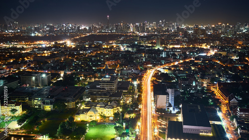 © bank215, Fototapeta premium night aerial view of cityscape and light tail on bridge and road