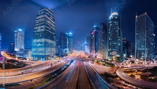 © 순단 강, Fototapeta premium Night aerial view of modern infrastructure buildings residential city