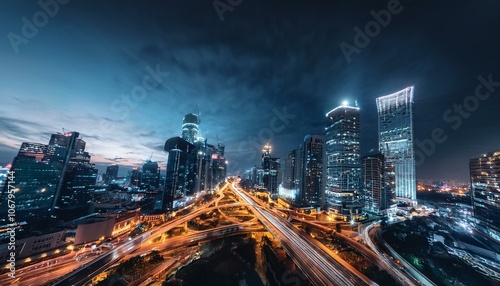 © 순단 강, Fototapeta premium Night aerial view of modern infrastructure buildings residential city