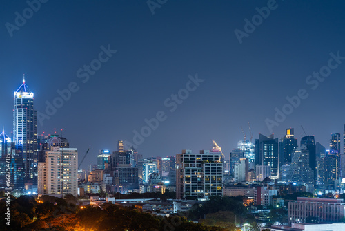© ImageFlow, Fototapeta premium Night Bangkok panoramic city view, green trees and skyscrapers. Copy space