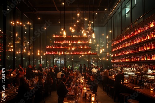 © Abdi, Naklejka premium Night bar scene, filled patrons, whiskey bottles, city view