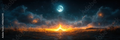 © tydeline, Naklejka premium Night Bonfire Under a Full Moon