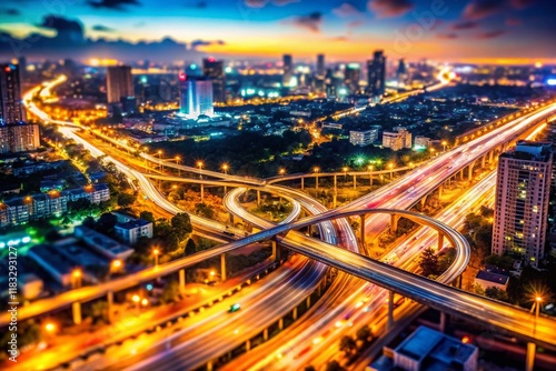 © Danicha, Fototapeta premium Night City Aerial: Illuminated Streets & Flowing Freeway Bokeh