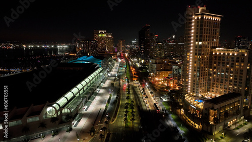 © bydronevideos, Obraz premium Night City At San Diego In California United States. Downtown City Skyline. Transportation Scenery. Night City At San Diego In California United States.