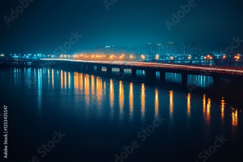 Fototapeta premium Night City Bridge Lights Reflecting on Water
