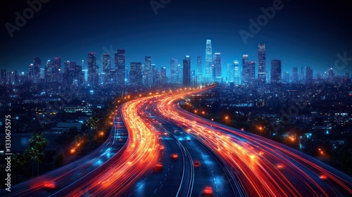© atul _art, Fototapeta premium Night City Highway: A Stunning View of Los Angeles Skyline at Night