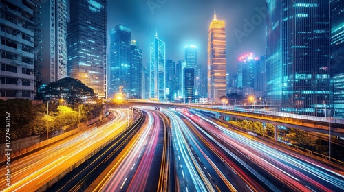 © Almahyra, Fototapeta premium Night city highway, lights trails, skyscrapers, busy urban scene, stock photo