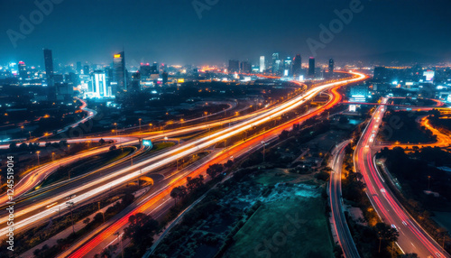 © De, Obraz premium Night City Highway Lightscape Stunning Aerial View