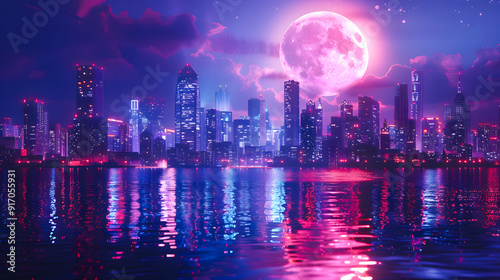 © Akash Tholiya, Fototapeta premium Night city in the light of the moon and neon lights