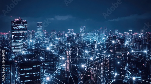 Fototapeta premium Night city network aerial view showing interconnected lights. Stock photo