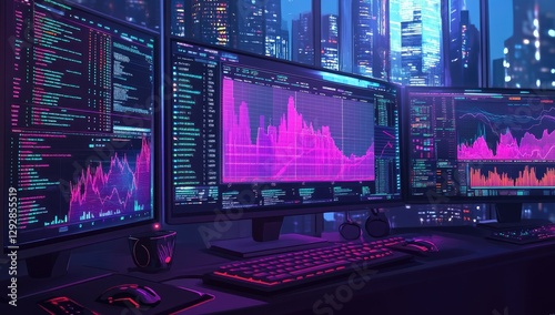 © a muh sakaria, Fototapeta premium Night city office workstation with graphs and code