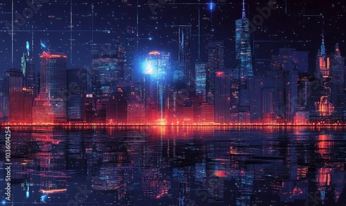© Александр Михайлюк, Obraz premium Night city panorama with network hologram