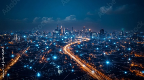 Fototapeta premium Night City Skyline Aerial View with Bright Lights