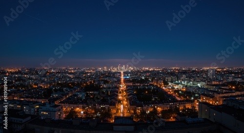 © AleniaFlow, Fototapeta premium Night City Skyline Aerial View with Illuminated Buildings and Stars