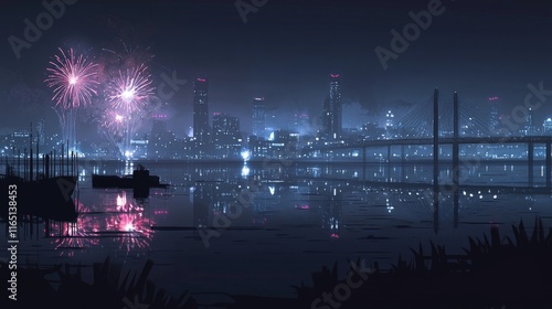 © Chom, Fototapeta premium Night City Skyline Fireworks Reflection Urban Nightscape